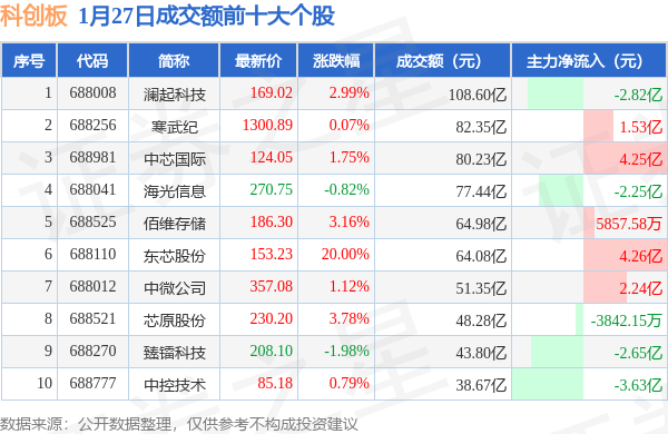 当日科创板成交额前10大个股中8只个股收涨,平均涨幅4.21%,其中澜起科技(688008)以成交额108.6亿元排第一。从主力资金流入看,成交额前10大个股中有5只个股呈现主力资金净流入。