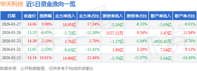 1月27日的资金流向数据方面,主力资金净流入10.95亿元,占总成交额17.34%,游资资金净流出5.26亿元,占总成交额8.33%,散户资金净流出5.69亿元,占总成交额9.01%。