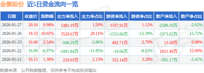 证券之星消息,金徽股份1月27日涨停收盘,收盘价20.16元。该股于9点33分涨停,13次打开涨停,截止收盘封单资金为595.69万元,占其流通市值0.03%。
