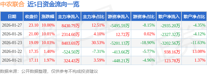 证券之星消息,中农联合1月27日涨停收盘,收盘价23.1元。该股于9点31分涨停,1次打开涨停,截止收盘封单资金为4.31亿元,占其流通市值14.64%。