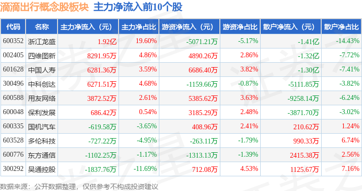 从资金流向上来看,当日滴滴出行概念股板块主力资金净流入1.79亿元,游资资金净流入9428.69万元,散户资金净流出2.73亿元。滴滴出行概念股板块个股资金流向见下表: