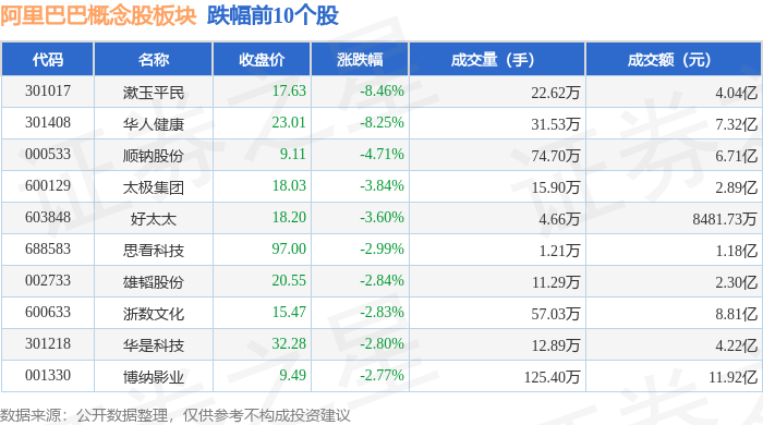 从资金流向上来看,当日阿里巴巴概念股板块主力资金净流出9838.1万元,游资资金净流出2.94亿元,散户资金净流入3.92亿元。阿里巴巴概念股板块个股资金流向见下表: