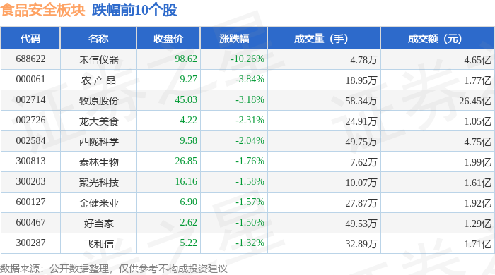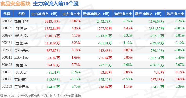 从资金流向上来看,当日食品安全板块主力资金净流出6.94亿元,游资资金净流入2.34亿元,散户资金净流入4.59亿元。食品安全板块个股资金流向见下表: