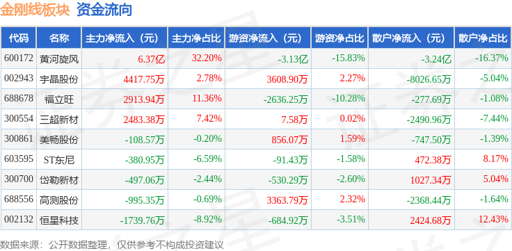 从资金流向上来看,当日金刚线板块主力资金净流入6.98亿元,游资资金净流出2.74亿元,散户资金净流出4.24亿元。金刚线板块个股资金流向见下表: