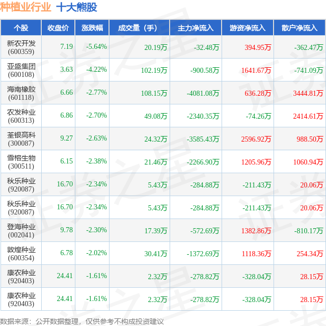 个股表现方面,种植业行业当日领跌股为新农开发(600359),该股当日报收7.19,下跌5.64%,成交量20.19万,主力资金净流出32.48万元。亚盛集团(600108)以下跌4.22%紧随其后,该股当日成交量102.19万,主力资金净流出900.58万元。除此之外,海南橡胶(601118)、农发种业(600313)、荃银高科(300087)均进入当日熊股之列。具体个股列表见下表:
