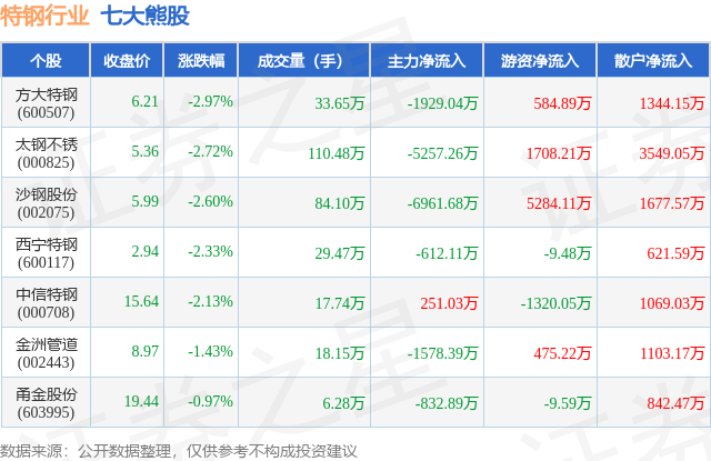 个股表现方面,特钢行业当日领跌股为方大特钢(600507),该股当日报收6.21,下跌2.97%,成交量33.65万,主力资金净流出1929.04万元。太钢不锈(000825)以下跌2.72%紧随其后,该股当日成交量110.48万,主力资金净流出5257.26万元。除此之外,沙钢股份(002075)、西宁特钢(600117)、中信特钢(000708)均进入当日熊股之列。具体个股列表见下表: