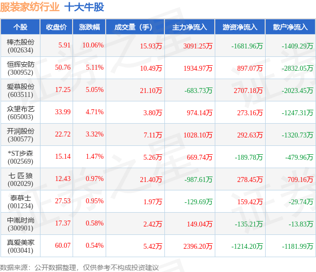 个股表现方面,服装家纺行业当日领涨股为棒杰股份(002634),该股当日报收5.91,上涨10.06%,成交量15.93万,主力资金净流入3091.25万元。恒辉安防(300952)以上涨5.11%紧随其后,该股当日成交量10.49万,主力资金净流入1934.97万元。除此之外,爱慕股份(603511)、众望布艺(605003)、开润股份(300577)均进入当日牛股之列。具体个股列表见下表: