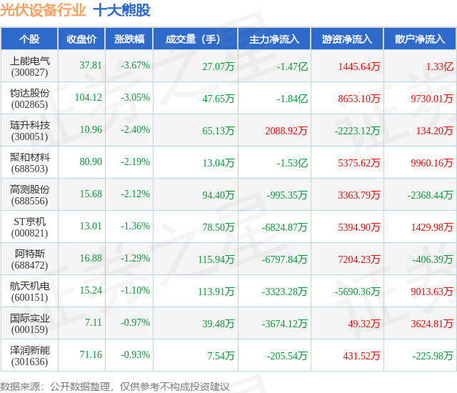 个股表现方面,光伏设备行业当日领跌股为上能电气(300827),该股当日报收37.81,下跌3.67%,成交量27.07万,主力资金净流出1.47亿元。钧达股份(002865)以下跌3.05%紧随其后,该股当日成交量47.65万,主力资金净流出1.84亿元。除此之外,琏升科技(300051)、聚和材料(688503)、高测股份(688556)均进入当日熊股之列。具体个股列表见下表: