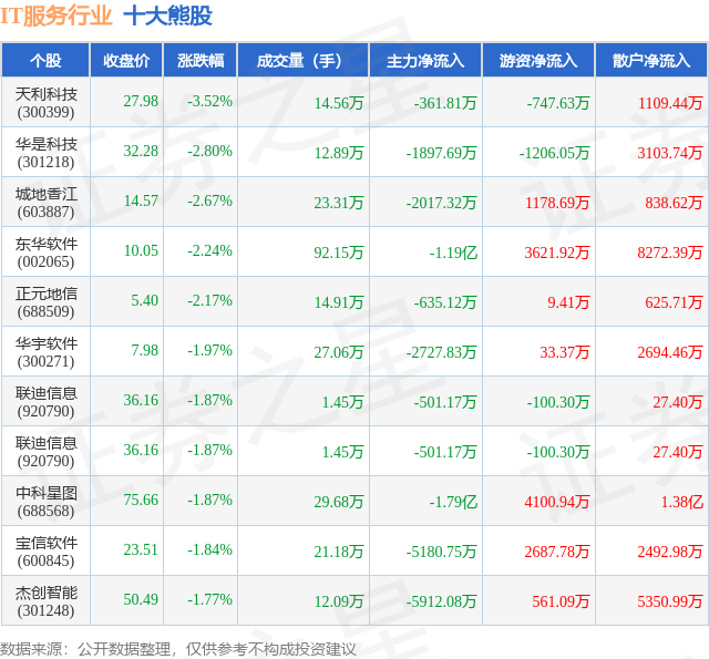 个股表现方面,IT服务行业当日领跌股为天利科技(300399),该股当日报收27.98,下跌3.52%,成交量14.56万,主力资金净流出361.81万元。华是科技(301218)以下跌2.8%紧随其后,该股当日成交量12.89万,主力资金净流出1897.69万元。除此之外,城地香江(603887)、东华软件(002065)、正元地信(688509)均进入当日熊股之列。具体个股列表见下表: