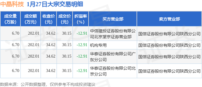 证券之星消息,1月27日中晶科技发生大宗交易,交易数据如下: