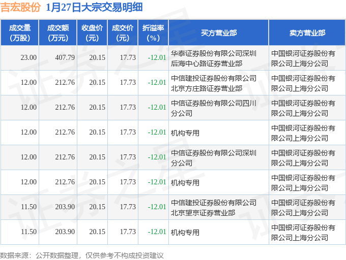 证券之星消息,1月27日吉宏股份发生大宗交易,交易数据如下: