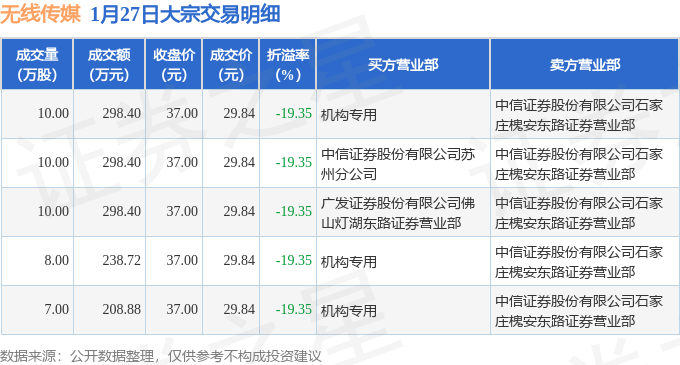 证券之星消息,1月27日无线传媒发生大宗交易,交易数据如下: