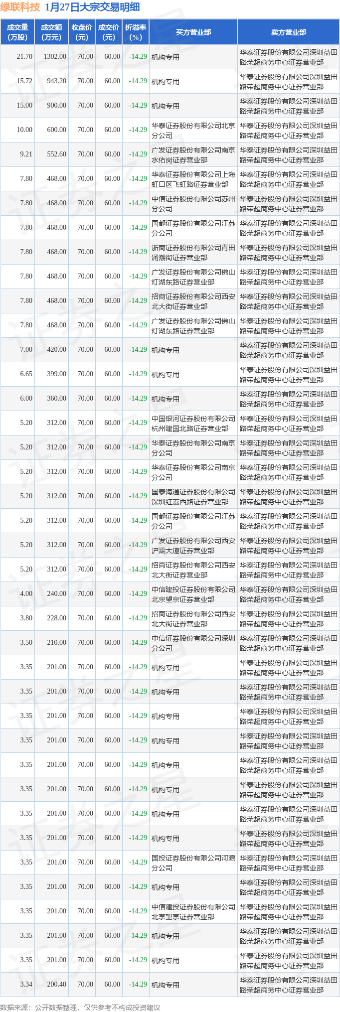 证券之星消息,1月27日绿联科技发生大宗交易,交易数据如下: