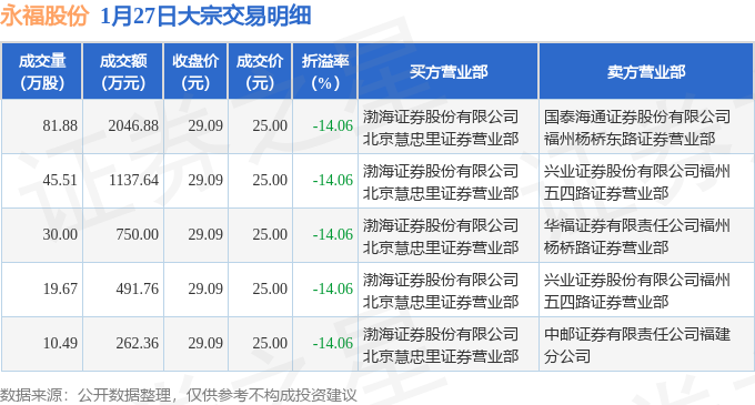 证券之星消息,1月27日永福股份发生大宗交易,交易数据如下:
