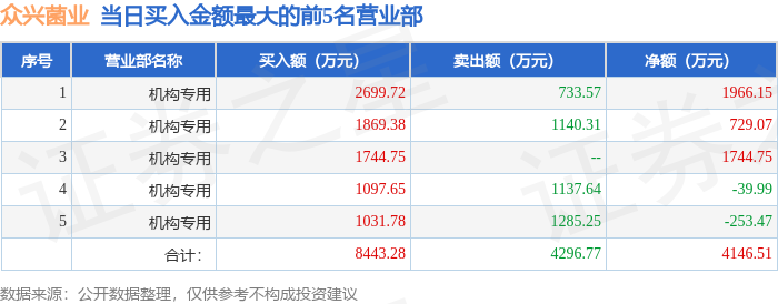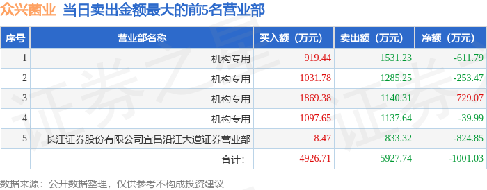证券之星消息,沪深交易所2026年1月27日公布的交易公开信息显示,众兴菌业(002772)因日振幅值达到15%的前5只证券登上龙虎榜。此次是近5个交易日内第1次上榜。