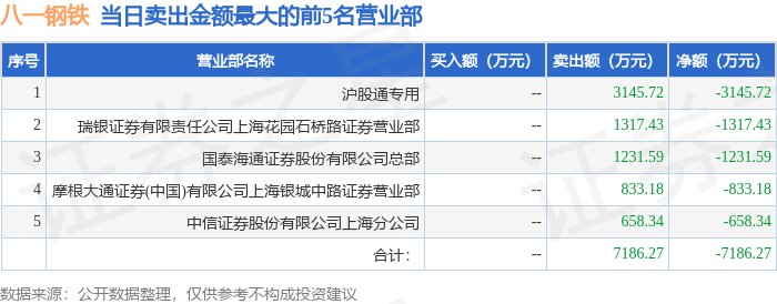 证券之星消息,沪深交易所2026年1月27日公布的交易公开信息显示,八一钢铁(600581)因有价格涨跌幅限制的日收盘价格跌幅偏离值达到7%的前五只证券登上龙虎榜。此次是近5个交易日内第1次上榜。