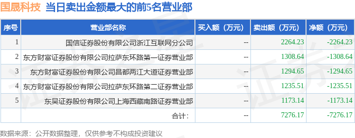 证券之星消息,沪深交易所2026年1月27日公布的交易公开信息显示,国晟科技(603778)因有价格涨跌幅限制的日收盘价格跌幅偏离值达到7%的前五只证券登上龙虎榜。此次是近5个交易日内第4次上榜。