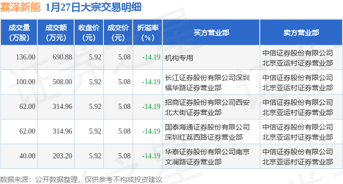证券之星消息,1月27日嘉泽新能发生大宗交易,交易数据如下: