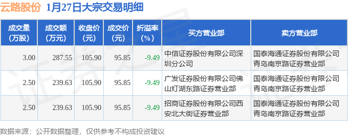 证券之星消息,1月27日云路股份发生大宗交易,交易数据如下: