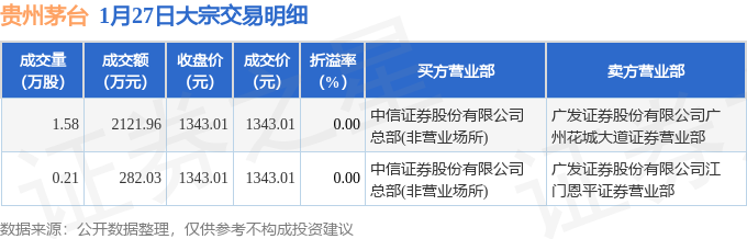 证券之星消息,1月27日贵州茅台发生大宗交易,交易数据如下: