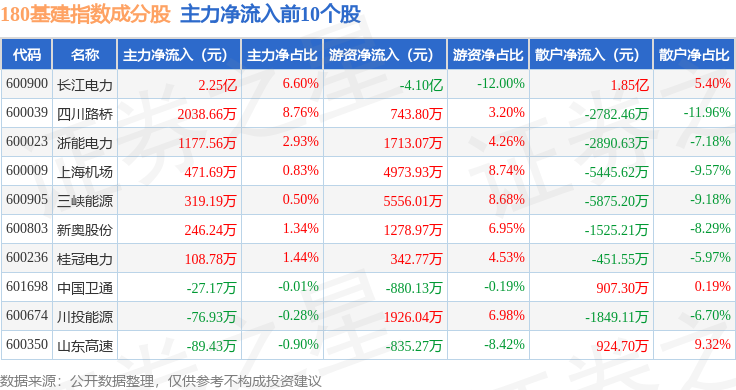 资金流向方面,180基建(000025)指数成份股当日主力资金净流出合计13.16亿元,游资资金净流入合计9.91亿元,散户资金净流入合计3.26亿元。成份股资金流向详情见下表: