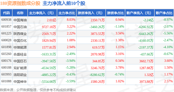 资金流向方面,180资源(000026)指数成份股当日主力资金净流出合计20.86亿元,游资资金净流入合计4.94亿元,散户资金净流入合计15.92亿元。成份股资金流向详情见下表: