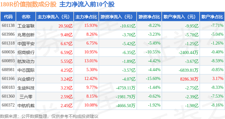 资金流向方面,180R价值(000031)指数成份股当日主力资金净流入合计29.87亿元,游资资金净流出合计5.32亿元,散户资金净流出合计24.55亿元。成份股资金流向详情见下表: