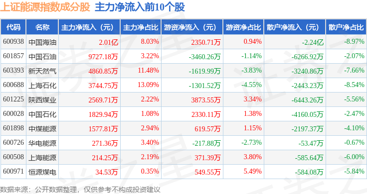 资金流向方面,上证能源(000032)指数成份股当日主力资金净流出合计7.52亿元,游资资金净流入合计5.51亿元,散户资金净流入合计2.01亿元。成份股资金流向详情见下表:
