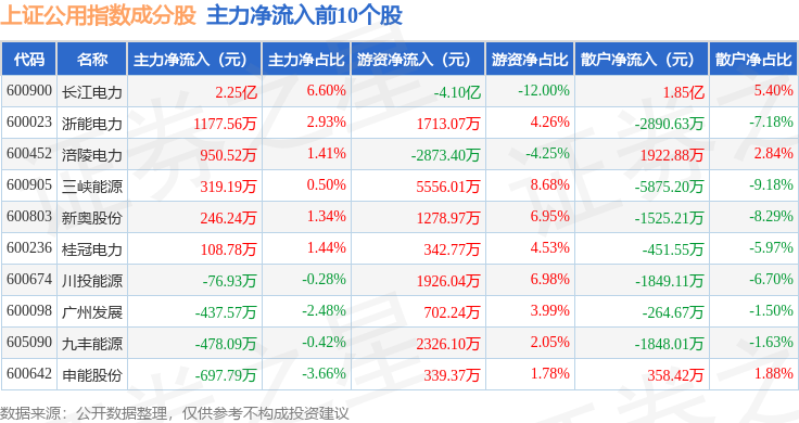 资金流向方面,上证公用(000041)指数成份股当日主力资金净流出合计7.33亿元,游资资金净流入合计1.41亿元,散户资金净流入合计5.92亿元。成份股资金流向详情见下表: