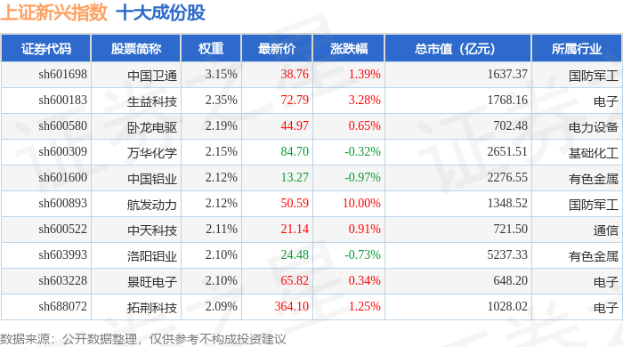 证券之星消息,1月27日,上证新兴(000067)指数报收于9741.08点,涨0.77%,成交1927.4亿元,换手率1.94%。当日该指数成份股中,上涨的有26家,航发动力以10.0%的涨幅领涨,下跌的有24家,特变电工以2.65%的跌幅领跌。