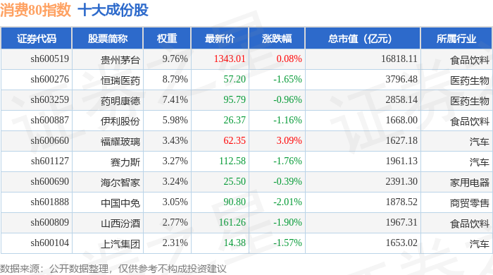 消费80(000069)指数十大成份股详情如下: