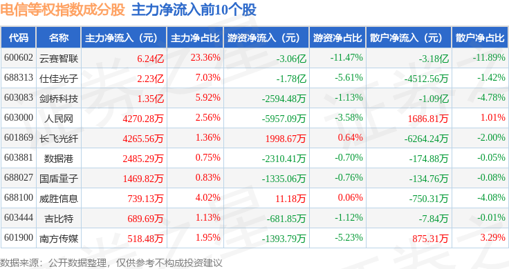 资金流向方面,电信等权(000078)指数成份股当日主力资金净流入合计6988.43万元,游资资金净流入合计3866.06万元,散户资金净流出合计1.09亿元。成份股资金流向详情见下表: