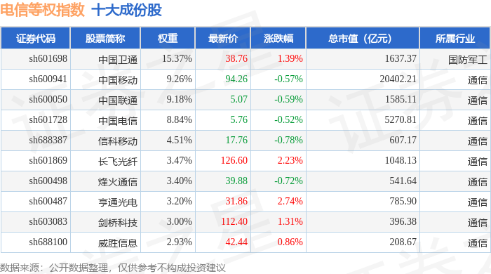 电信等权(000078)指数十大成份股详情如下: