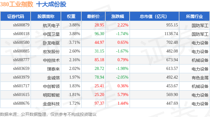380工业(000106)指数十大成份股详情如下: