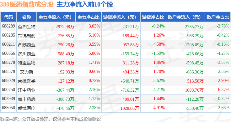 资金流向方面,380医药(000109)指数成份股当日主力资金净流出合计7.2亿元,游资资金净流入合计1.57亿元,散户资金净流入合计5.63亿元。成份股资金流向详情见下表: