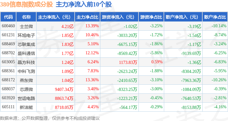 资金流向方面,380信息(000111)指数成份股当日主力资金净流入合计8.65亿元,游资资金净流出合计4.51亿元,散户资金净流出合计4.14亿元。成份股资金流向详情见下表: