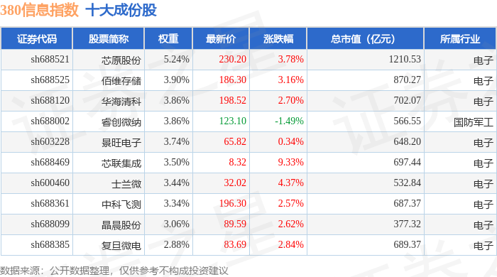 证券之星消息,1月27日,380信息(000111)指数报收于11774.07点,涨3.02%,成交674.88亿元,换手率4.06%。当日该指数成份股中,上涨的有38家,盛科通信以20.0%的涨幅领涨,下跌的有12家,至纯科技以5.49%的跌幅领跌。