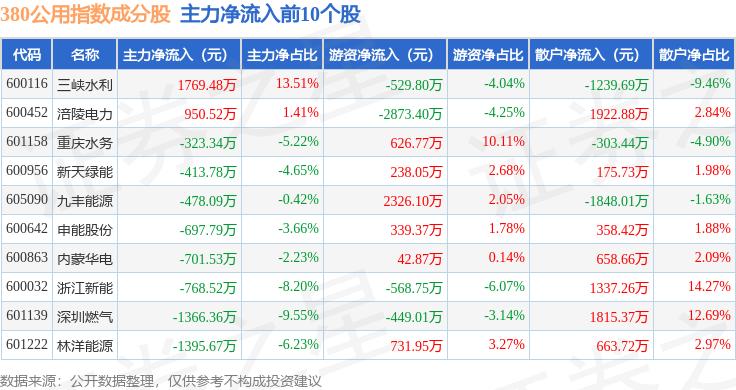 资金流向方面,380公用(000113)指数成份股当日主力资金净流出合计4.84亿元,游资资金净流入合计3459.29万元,散户资金净流入合计4.49亿元。成份股资金流向详情见下表: