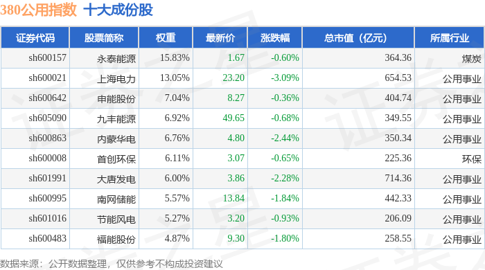 380公用(000113)指数十大成份股详情如下: