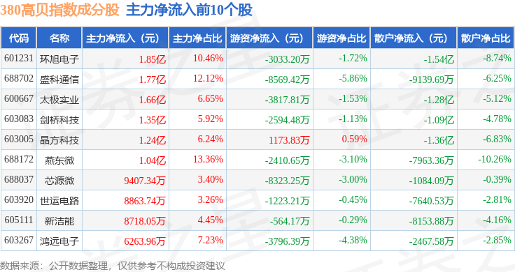 资金流向方面,380高贝(000137)指数成份股当日主力资金净流出合计18.18亿元,游资资金净流入合计9155.01万元,散户资金净流入合计17.26亿元。成份股资金流向详情见下表: