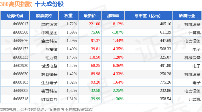 380高贝(000137)指数十大成份股详情如下: