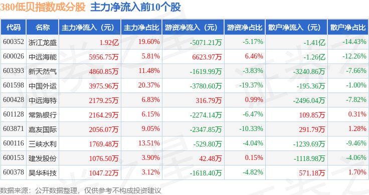 资金流向方面,380低贝(000138)指数成份股当日主力资金净流出合计12.4亿元,游资资金净流入合计3.08亿元,散户资金净流入合计9.32亿元。成份股资金流向详情见下表: