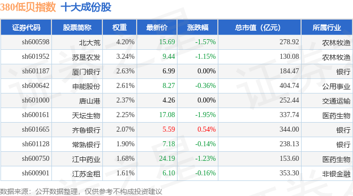 380低贝(000138)指数十大成份股详情如下: