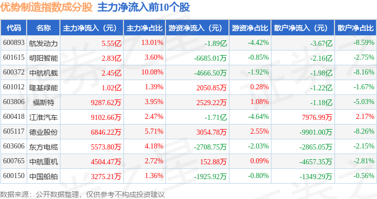 资金流向方面,优势制造(000146)指数成份股当日主力资金净流出合计38.84亿元,游资资金净流入合计6.75亿元,散户资金净流入合计32.1亿元。成份股资金流向详情见下表: