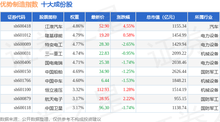 证券之星消息,1月27日,优势制造(000146)指数报收于8863.29点,涨0.65%,成交1231.44亿元,换手率3.1%。当日该指数成份股中,上涨的有31家,航发动力以10.0%的涨幅领涨,下跌的有18家,中国西电以4.71%的跌幅领跌。