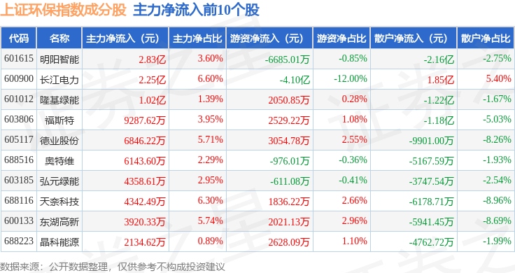 资金流向方面,上证环保(000158)指数成份股当日主力资金净流出合计17.98亿元,游资资金净流入合计4.81亿元,散户资金净流入合计13.17亿元。成份股资金流向详情见下表: