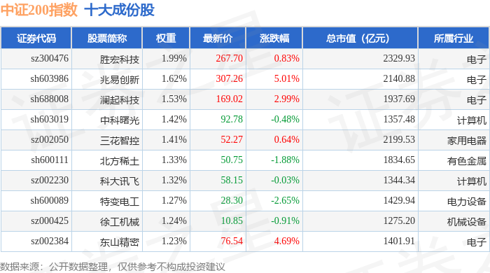 中证200(000904)指数十大成份股详情如下: