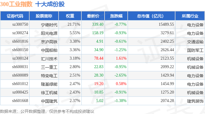 300工业(000910)指数十大成份股详情如下: