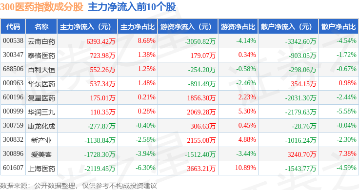 资金流向方面,300医药(000913)指数成份股当日主力资金净流出合计10.41亿元,游资资金净流入合计2.18亿元,散户资金净流入合计8.23亿元。成份股资金流向详情见下表: