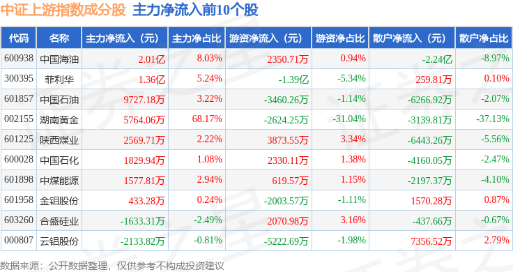 资金流向方面,中证上游(000961)指数成份股当日主力资金净流出合计82.48亿元,游资资金净流入合计16.31亿元,散户资金净流入合计66.17亿元。成份股资金流向详情见下表: